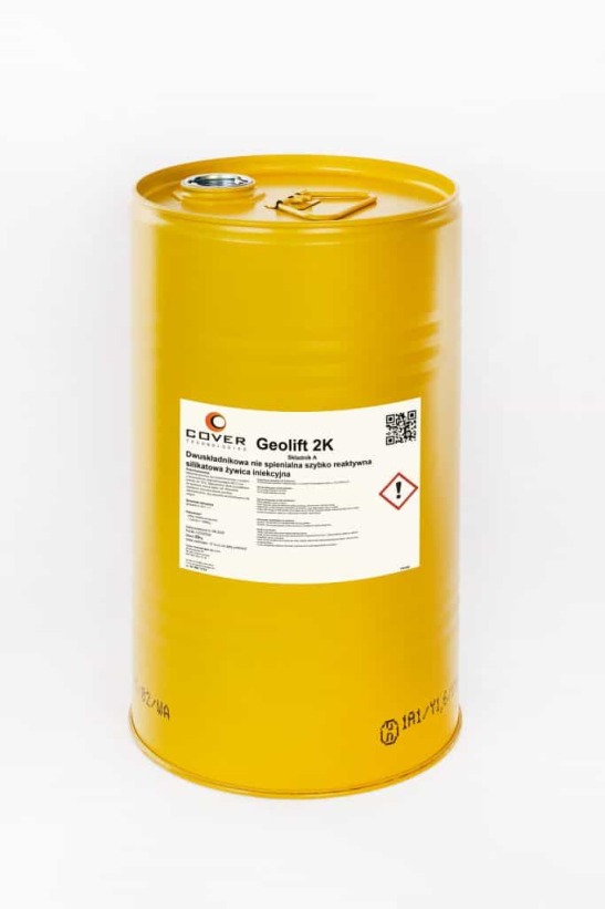 Geolift 2K is a two-component silicate adhesive and sealing system, component A of which is a mixture of sodium silicates and auxiliaries, and component B is a mixture of diphenylmethane diisocyanate (MDI), isomers and homologues with non-reactive diluents. Geolift 2K is created by mixing components A and B in a 1:1 volume ratio.